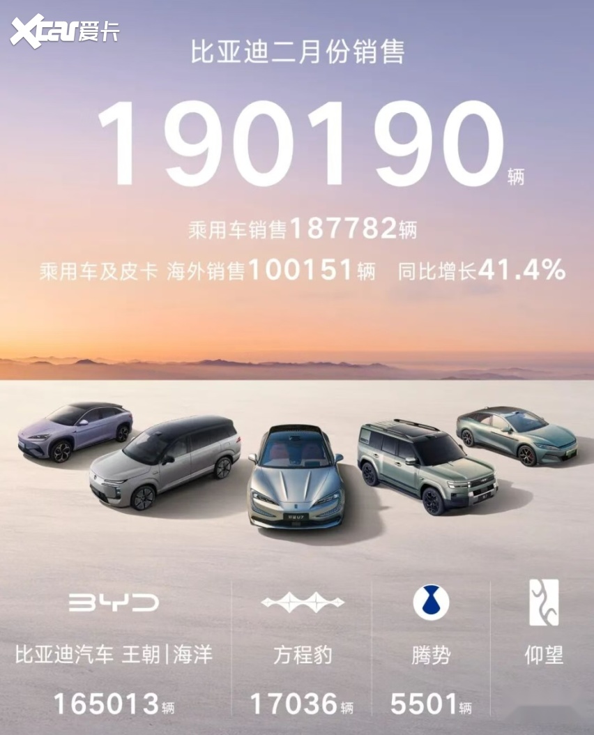 2月,比亚迪销量为19万台,其中,乘用车和皮卡海外销量超10万台,同比增长41.4%——海外销量首次超过国内销量。1-2月,比亚迪海外累计销量超20万台。2025年,比亚迪海外销量已经达到105万辆。2026年,比亚迪海外目标为130万辆,按照目前每月出口10万辆的势头来看,这个目标恐怕也保守了。