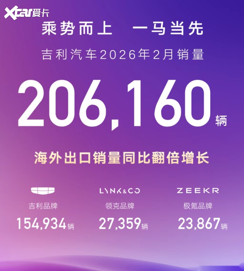 吉利对海外市场已经发起猛烈攻势。2月,吉利出口超6万辆,同比增长138%,和今年1月相当,算是“开门红”。2026年,吉利汽车的出口目标为65万台,并不算太激进。按照目前6万台/月的势头,以及后续产品扩增、渠道布局来看,吉利今年达成海外目标的压力不算大。