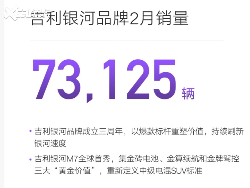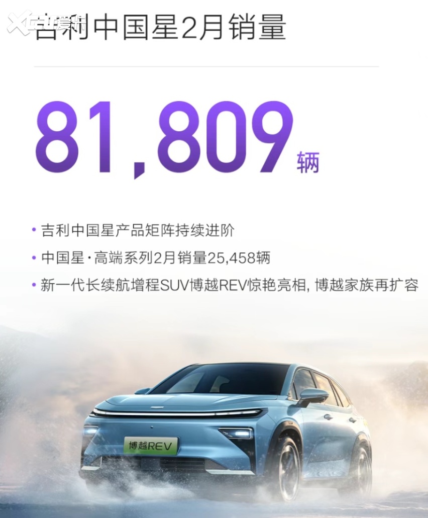 吉利汽车主张油电同进。2月,其新能源销量达11.7万辆,同比增长19%,新能源占比57%;银河销量达7.3万台,是吉利新能源的主力军——不过,这也意味着,传统燃油车仍然支撑了吉利的半壁江山。吉利中国星单月销量超8万台,其中高端系列销量超2.5万台。官方已预告增程新车吉利博越REV,后续,吉利品牌的博越系列或将强势渗透“绿牌车’主战场。
