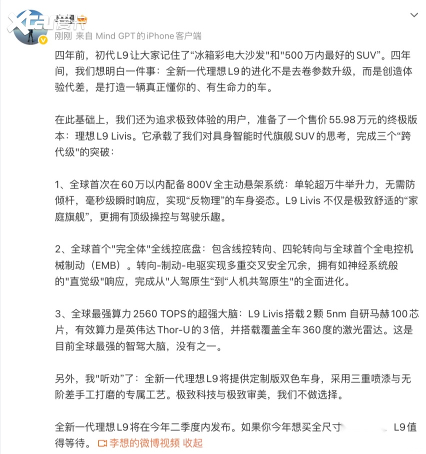 理想 L9 Livis已经公布了售价55.98万元,起了个定调效果,而全新一代理想L9将会在二季度内正式发布;理想L7、L6也将在5-6月迎来大改款。这波升级的核心亮点在于全系标配5C超充技术、电池容量升级、智能辅助驾驶提升和舒适性优化——从精英奶爸切换到科技先锋,理想同样也要经历品牌转型之考。